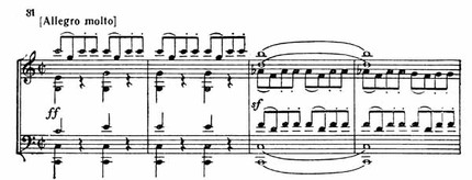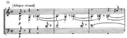 После этого бурно врывается F-dur, и с огнем и блеском снова воцаряется тема побочной и далее связующей партий. Их развитие приводит к кульминации разработки (пример 72).