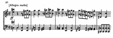 Здесь эта тема звучит как клич полководца, поднимающего воинственный пыл своего войска в разгаре сражения. Затем она постепенно затухает, уступая место игре ответов и откликов. Далее вступает тема побочной партии (пример 82).