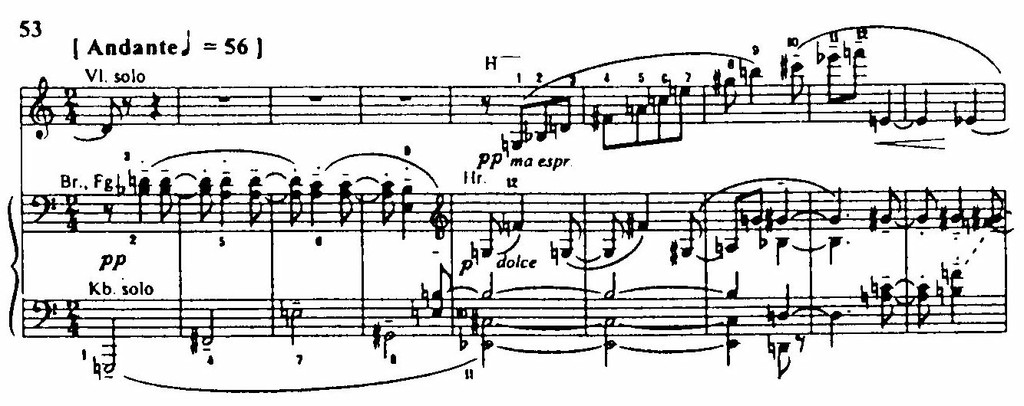 Наличие такого количества трезвучий указывает на творческое использование додекафонной техники, на отход от ортодоксальной додекафонии. Додекафонная техника Берга вообще менее строга, чем у Шёнберга, поскольку эпизодически он нарушает ее существенные правила – обязательность полного проведения серии или исключение из звуковысотной ткани элементов, ничем не связанных с серией.