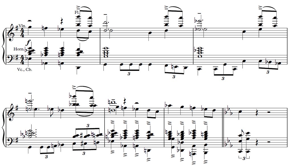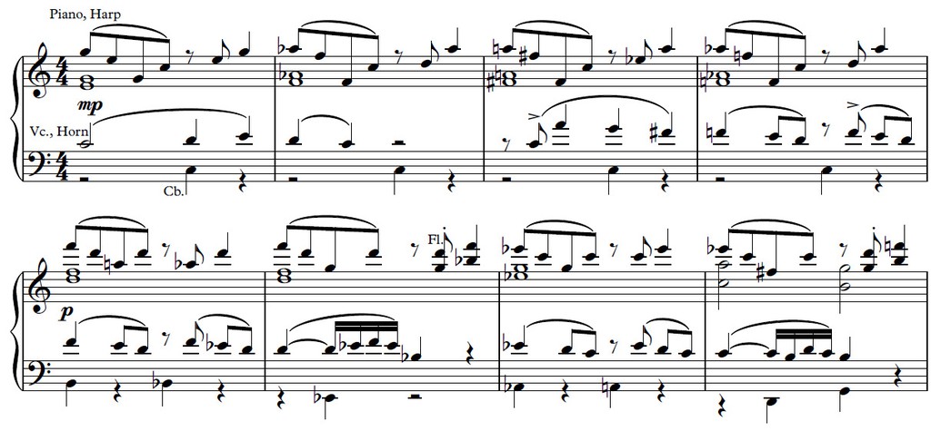 Столько событий на первой странице партитуры! Это вступление. Перелистываем. Начинается действие, которое слагается из четырёх эпизодов по принципу вариантного развития. В первом альты, виолончели и контрабасы пока еще в бестелесной фактуре – параллельном движении медленно и ровно ползущих квартово-октавных аккордов на фоне остинатного синкопированного ритма тремоло литавр и скрипок - экспонируют сурово-архаичную тему сотворения мира, главный лейтмотив произведения. И сразу же возникает конфликт: врывается еще одна важнейшая тема цикла – лейтмотив разрушения, резко контрастирующая основной (короткий четырёхзвучный мотив из двух малых терций, соединённых уменьшённой квартой с резким ритмом и не менее резким тембром - унисон флейты, пикколо и фортепиано).