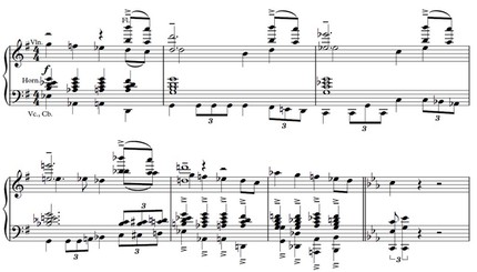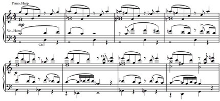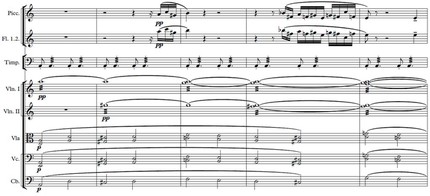 Чтец: «Бог увидел, что Свет хорош, и отделил его от Тьмы». В пятом такте появляется третий фактурный пласт: у контрабасов зарождается основная тема, тяжело поднимающаяся из тьмы - лейтмотив сотворения мира. А в шестом включается четвёртый пласт: в партии флейты и флейты пикколо, ксилофона, арф и фортепиано в высоком регистре мерцают, словно «осколки взрыва», отблески света. Зарождение тематизма - зарождение мира произведения - зарождение жизни. Параллельное развитие «верха» и «низа» символизирует отделение Света от Тьмы.