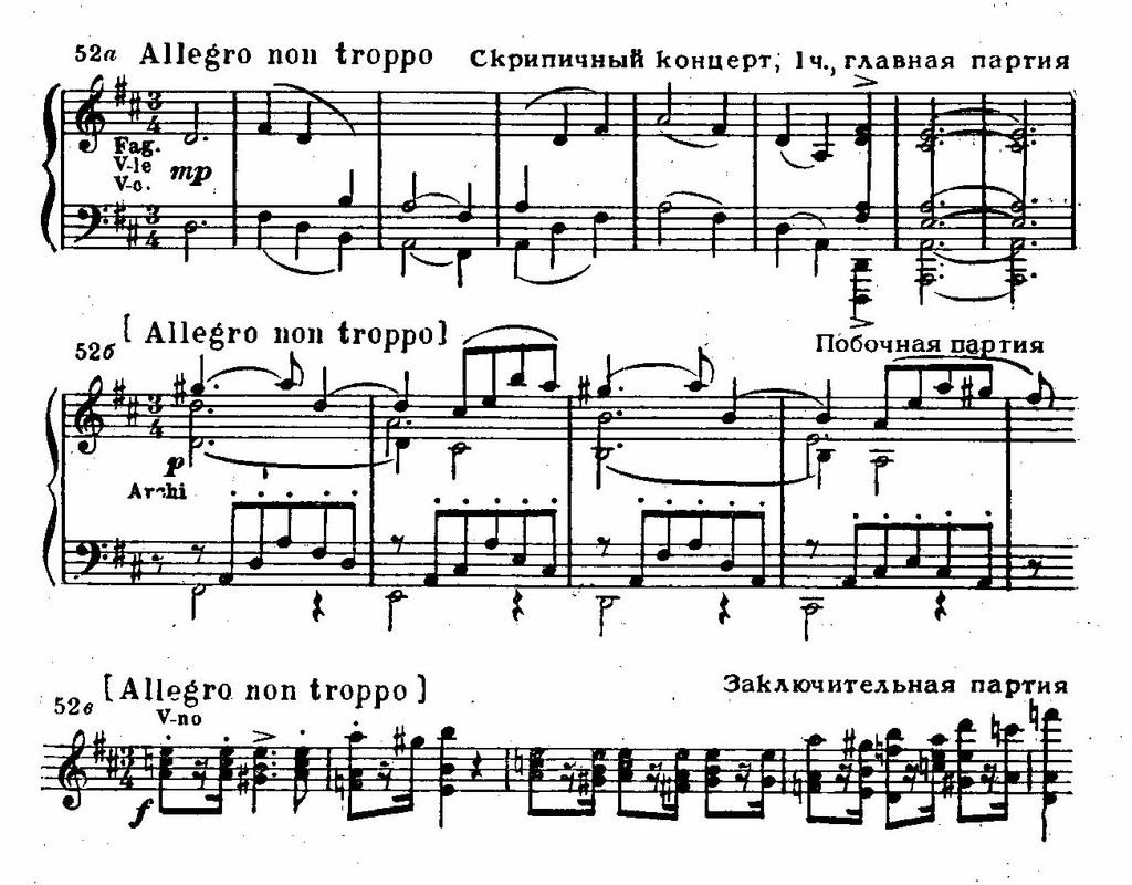 Скрипичный концерт D-dur ор. 77 (1878) стоит в ряду лучших произведений этого жанра в мировой литературе. Разнообразный круг образов затронут в первой части. Он представлен в самой экспозиции — в сопоставлении пасторального звучания главной партии, лирико-драматических порывов побочной и решительных, энергично-волевых возгласов заключительной: