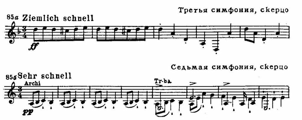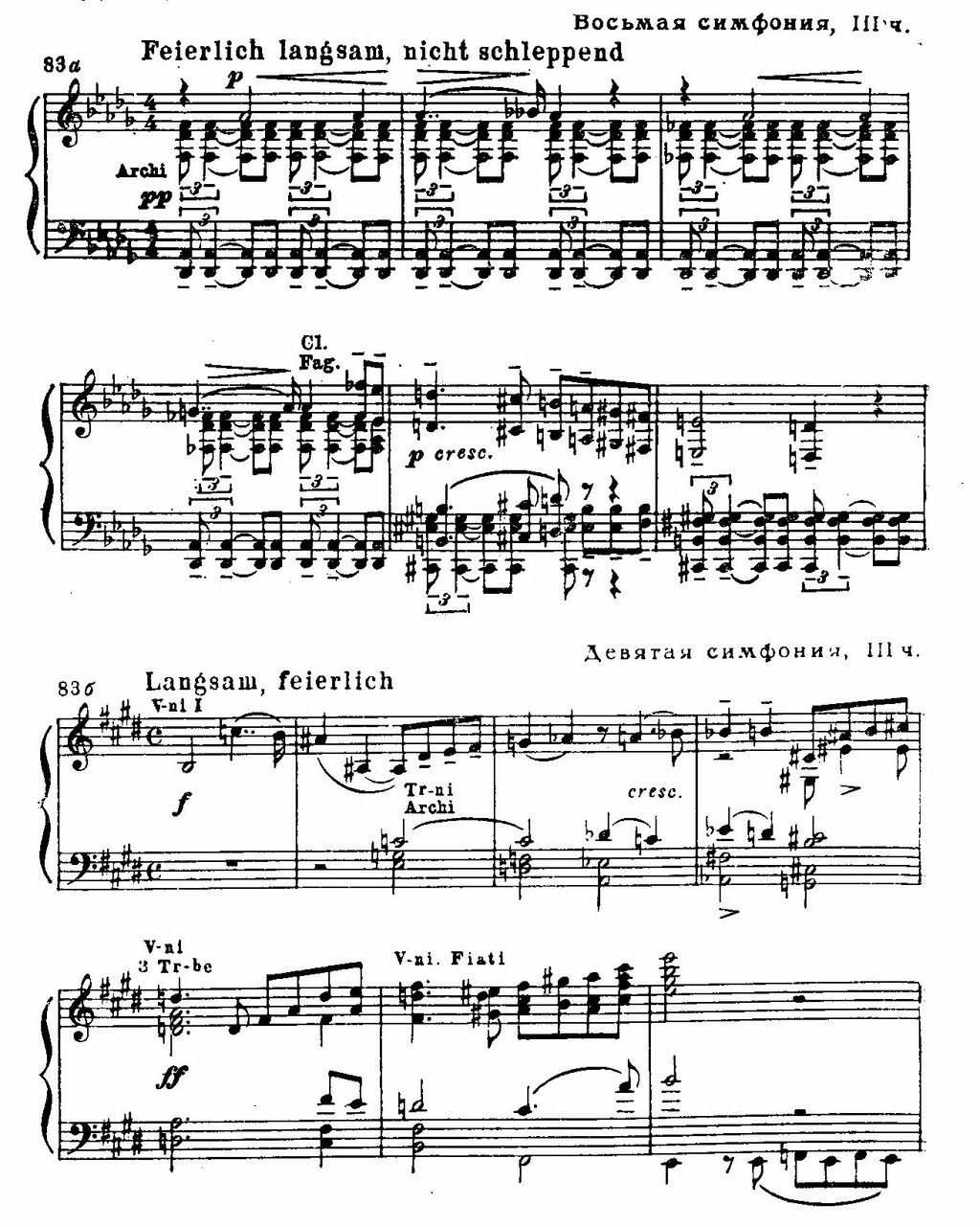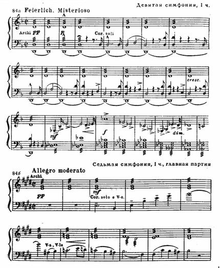Большим своеобразием отмечен оркестровый стиль Брукнера. Конечно, и здесь были учтены завоевания Листа — Вагнера, но, используя некоторые их приемы, он не потерял своей самобытной индивидуальности. Самобытность же ее заключалась в том, что с юношеских лет и до последних дней Брукнер оставался верен своему любимому инструменту — органу. За органом он импровизировал, и в духе свободных импровизаций родились его симфонические фрески. Точно так же оркестр представлялся ему в виде монументального идеального органа. Именно органная звучность с ее несмешивающимися регистровыми тембрами определила склонность Брукнера к раздельному использованию основных групп оркестра, к мощному, но ясному по колориту tutti, к привлечению медных духовых инструментов в гимническом проведении мелодии, к трактовке, как сольных голосов, деревянных духовых и т. п. И струнную группу Брукнер подчас приближал к звучанию соответствующих органных регистров. Так, он охотно применял тремоло (см. пример 84 а, б), мелодическое пиццикато в басах и т. д.