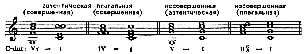1) Заключительный гармонич. (а также мелодич.) оборот, завершающий муз. построение и придающий ему законченность, цельность. В мажоро-минорной тональной системе 17–19 вв. в К. обычно сочетаются метроритмич. опорность (напр., метрич. акцент в 8-м или 4-м такте простого периода) и остановка на одной из наиболее важных в функциональном отношении гармоний (на I, V, реже на IV ступени, иногда и на др. аккордах). Полные, т. е. заканчивающиеся на тонике (Т), К. по аккордовому составу подразделяются на автентические (V–I) и плагальные (IV–I). К. является совершенной, если T появляется в мелодич. положении примы, в тяжёлом такте, после доминанты (D) или субдоминанты (S) в осн. виде, а не в обращении. Если одно из этих условий отсутствует, К. считается несовершенной. К., заканчивающиеся на D (или S), наз. половинными (напр., I–V, II–V, VI–V, I–IV); разновидностью половинной автентич. К. можно считать т. н. фригийский каданс (заключит. оборот типа IV6-V в гармонич. миноре). Особый вид составляют т. н. прерванные (ложные) К. — нарушение автентич. К. вследствие замены тонич. трезвучия др. аккордом (V–VI, V–IV6, V–IV, V-16 и др.).