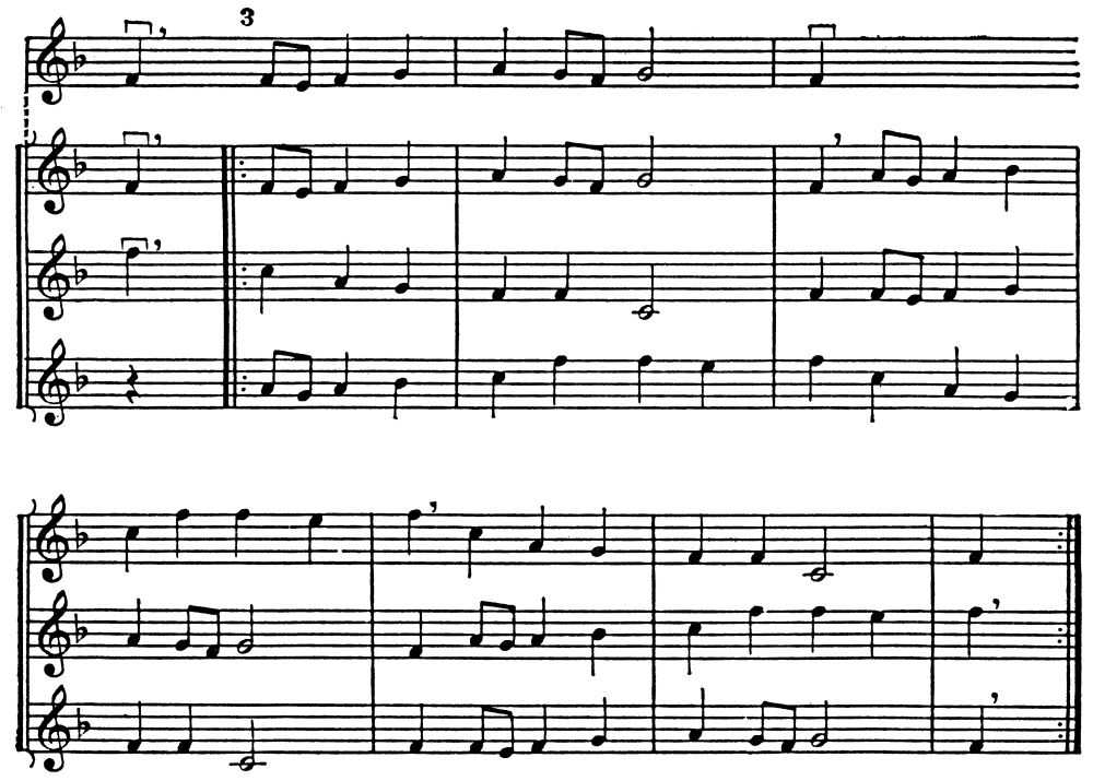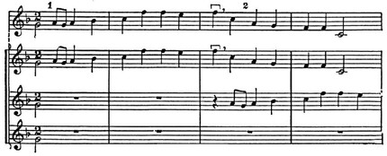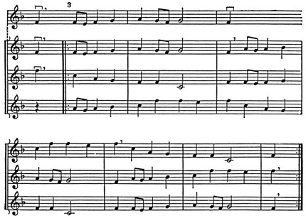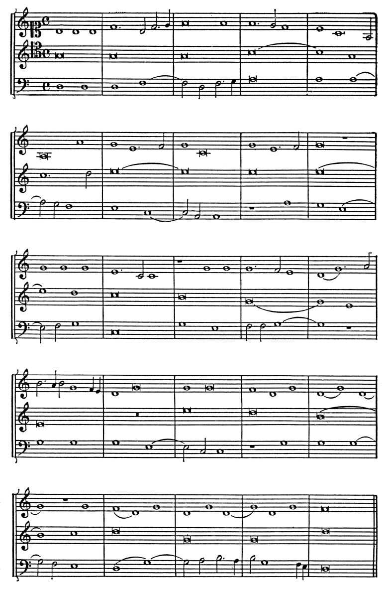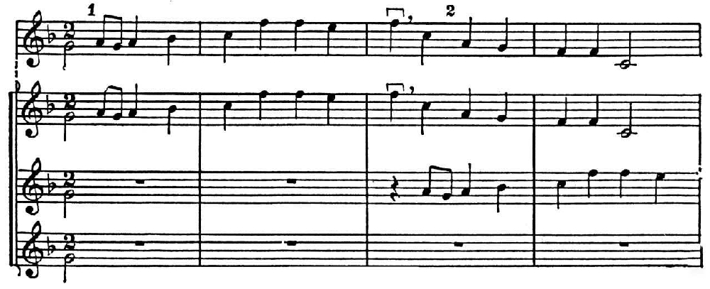 Простейшее соотношение голосов в К. — точное проведение пропосты в риспосте или риспостах. Образуется один из видов К. «в прямом движении» (лат. canon per motum rectum). К этому типу могут быть отнесены и К. в увеличении (canon per augmentationem), в уменьшении (canon per diminutionem), с разл. метрич. оформлением голосов («мензуральный», или «пропорциональный», К.). В первых двух из этих видов К. риспоста или риспосты полностью отвечают пропосте по мелодич. рисунку и соотношению длительностей, однако абсолютная длительность каждого из тонов в них соответственно увеличена или сокращена в неск. раз (двойное, тройное увеличение и т. п.). «Мензуральный», или «пропорциональный», К. связан по происхождению с мензуральной нотацией, в к-рой допускалось двухдольное (imperfecte) и трёхдольное (perfecte) дробление тех же длительностей.