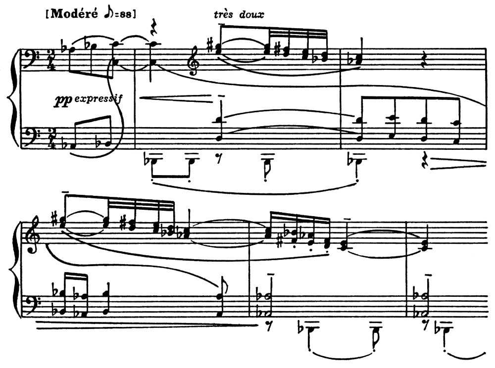 К. Дебюсси. Прелюдии для фортепиано, No 2, «Паруса», такты 9–14.