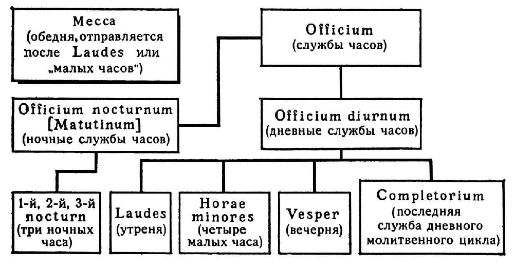 Все канонизированные церк. песнопения можно разделить на 2 большие группы: напевы, сопровождающие главный католич. обряд — мессу, и напевы, предназначенные для исполнения во время всех прочих служб — т. п. часов или Officium. Формы Officium окончательно закрепил в 6 в. Бенедикт. Среди служб Officium различают т. н. большие часы (Matutinum, Laudes, Vesper, Completorum) и малые (Prima, Tertia, Sexta, Nona), ночные (Officium nocturnum, или Matutinum) и дневные (Officium diurnum).