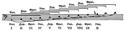 Церковный звукоряд включает 12 ступеней; нижние звуки каждого согласия отстоят на чистую кварту друг от друга. Терции, образующиеся от каждой из ступеней согласия, расположены в строгом порядке: ионийская, дорийская, фригийская.