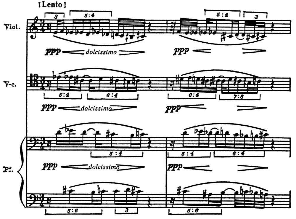 Э. В. Денисов. Трио для скрипки, виолончели и фп., 1-я часть, такты 28–29.