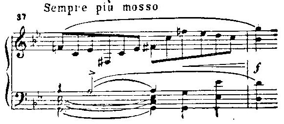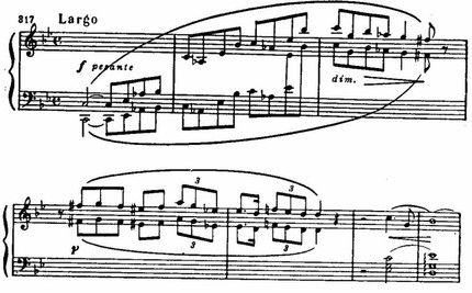 Эмоциональное напряжение драматической кульминации в коде продолжается и нарастает с неослабевающей силой. Только резкая перемена фактуры (во второй фазе коды) предвещает начало конца. Лавина гаммообразных пассажей едва сдерживается волевым напряжением пунктирно-ритмованных аккордов.