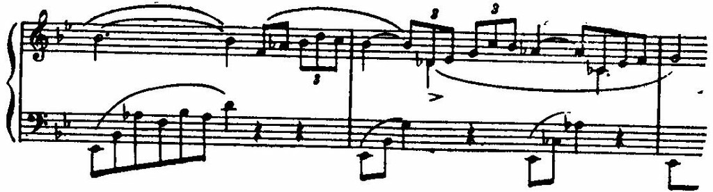 После доминантового crescendo (с новыми обыгрываниями и звонкими переборами) второй раздел баллады заканчивается переходом из соль минора в доминанту си-бемоль мажора (использовано увеличенное трезвучие), которая затухает на пустых квартах-квинтах. Должна как будто вступить вторая, B-dur'ная тема. В действительности эта тема (где особенно замечательны ласковые, „убеждающие" акценты в противоположность печальным вздохам первой темы, ритмика квазимазурки, мелодизация баса, секвенции) с самого начала стремится из B-dur в Es-dur, которого и достигает в коде „экспозиции" баллады (такты 15 и дальнейшие от начала Meno mosso). Кода завершает характер второй темы с ее спокойной песенно-речитативной лирикой. С такта 27 Meno mosso опять развивается материал первой темы — здесь уже не томительно-печальный, но тревожно-страстный. Весь этот раздел с его задержаниями и подъемами (Отметим попутно аккорд а—с—dis—gis, позднее получивший самостоятельное колористическое значение у Равеля. Аналогии у Шопена: баллада ор. 52 (такт 34), скерцо ор. 54 (такт 188 от начала piu lento), скерцо ор. 31 (такт 257 от начала А-dur'ной части), этюд ор. 25 № 7 (такт 21), этюд ор. 25 № 10 (такт 19 средней части), прелюд ор. 28 № 4 (такт 12), мазурка ор. 56 № 3 (такт 184), полонез ор. 40 № 2 (такт 18 от конца), полонез-фантазия ор. 61 (такт 76), соната h-moll (первая часть, такт 62, и третья часть, такт 33 от конца) и др. Сходные моменты у других композиторов (предшественников и современников Шопена): Бетховен — соната ор. 28 (вторая часть, такт 28 от конца и др.), соната ор. 57 (первая часть, такт 32, третья часть, такт 118 и др.), соната ор. 106 (третья часть, такт 20); Шуберт — соната ор. 164 (первая часть, такт 54); Гуммель — концерт h-moll ор. 89 (первая часть, такты 12, 14 и др.); Шуман — „Просящее дитя" (такт 1), „Вещая птица" (такт 3). Происхождение этой гармонии — диатоническое обыгрывание верхней ноты уменьшенного септаккорда.) построен на доминанте последующей тональности (а—А). Наконец — триумф, праздник второй темы в ля мажоре. Замечательны тут: свобода голосоведения в обеих руках, полнота звучности, подголосочная полифония, секвенции. Тема ведет через пассажи октав на органном пункте е (тут „политональный" момент: h-moll и cis-moli на е) к скату септаккорда второй ступени es-moll (dis-moll). Пылкий восторг разрешился криком тревоги. Такты 25-31 от начала вступления второй темы в ля мажоре — образец мелодических обыгрываний, порождающих диссонансы и внетональности. С такта 33 — Es-dur'ная интермедия. Роль этой интермедии в форме — распыление энергии, ранее накопленной, превращение страстного в грациозно и вызывающе блестящее. После звонких арабесок начинается, однако, новое нарастание, ведущее через хроматические секвенции к суровости fis-moll и далее — вновь к ясности Es-dur.