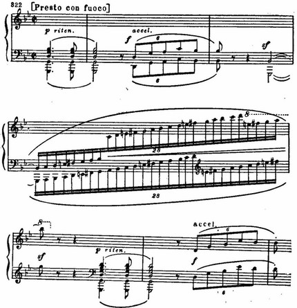 Кода — Presto con fuoco — последний акт драмы. Напряжение неустойчивости главной партии и предыкта к коде разрешается, наконец, в тонику основной тональности, но это производит «обратное действие», становится источником новой драматической вспышки. Стихийность стремительного движения, резкие, непрерывно смещающиеся акценты совсем скрадывают знакомые очертания тем; все же их интонации проникают в толщу фактуры, насыщают ее своей выразительностью.