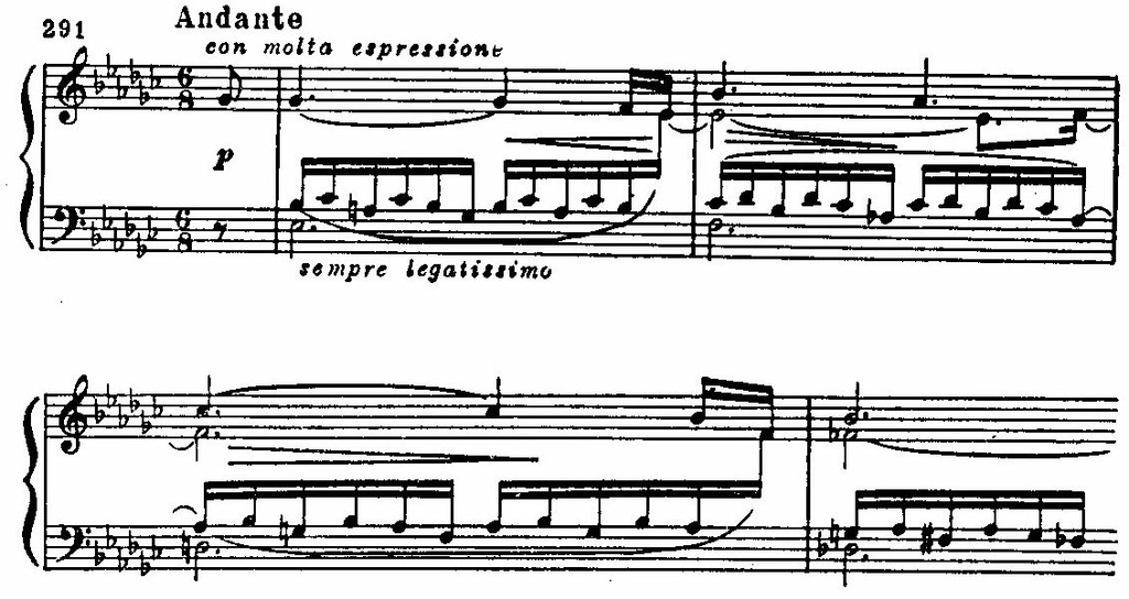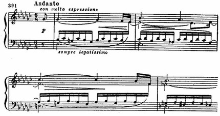 — своеобразный ноктюрн, в котором центральная роль отведена партии левой руки. На большом «виолончельном» диапазоне раскинута кантабильная выразительная мелодия. Ее звучание обогащает тонко разработанная фактура, всевозможные виды выразительной фигурации.