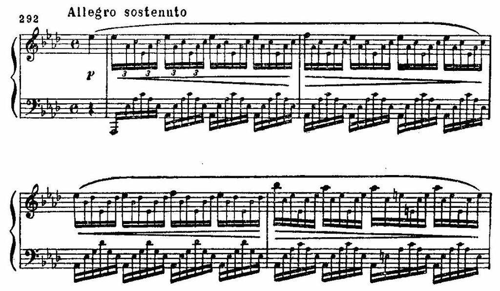 Предшественников Шопена в создании нового жанра этюда, в котором художественные идеи самого высокого уровня оказываются неразрывно связанными с прямой педагогической задачей, следует искать не среди авторов фортепианных этюдов. Произведения в этом жанре выдающихся педагогов и виртуозов шопеновской эпохи (Клементи, Крамера, Гуммеля и других) не возвысились в целом над инструктивной литературой. Путь, на который вступил Шопен, создавая в своих этюдах высокохудожественные миниатюры неустаревающего значения, ему указали выдающиеся композиторы, творившие в других сферах. Прежде всего, это был Паганини, который, выступая в Варшаве в 1829 году, потряс молодого Шопена романтической новизной и художественной самостоятельностью своих скрипичных этюдов. Их влияние ощутимо и в смелом подходе Шопена к этому «ограниченному» педагогическому жанру, и в его романтическом выразительном облике, и в колоссальных виртуозных трудностях. Во-вторых, нити от шопеновских этюдов безусловно прослеживаются к «Музыкальным моментам», «Экспромтам» и даже к некоторым романсным аккомпанементам Шуберта (вроде «Маргариты за прялкой» или «Баркаролы»). Так же, как это впоследствии сделал Шопен, Шуберт, намечая некоторые основы романтического камерного пианизма, создавал эти произведения на основе какого-нибудь одного определенного пианистического приема, проходящего по принципу остинатности через всю пьесу или крупный раздел ее. При этом каждый технический оборот был носителем яркой и неповторимой художественной идеи (см. примеры 102, 103, 116). Наконец, вспомним, что у Шопена был еще один бесспорный, хотя и далекий предшественник, о котором он сам вряд ли догадывался. Им был Доменико Скарлатти, создавший в середине XVIII века несколько сотен этюдов (или, как он их сам называл, экзерсисов), известных в наше время под названием сонат. Скарлатти исчерпывающе разработал все технические приемы современного ему клавирного исполнительства в неразрывной связи с их образно-эмоциональной стороной и, подобно польскому композитору, создал в своих «этюдах» произведения большой художественной силы.