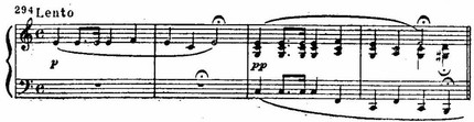 Через сокращенную репризу развитие стремительно движется к развязке, к коде. В этом последнем проведении темы концентрируется драматическая энергия всего произведения. Плотности и массивности ее аккордового звучания при резкости пунктирного ритма способствует тесное расположение в низких регистрах. В заключительном аккорде берет начало a-moll’ная гамма, которая молнией пробегает по всему диапазону фортепиано и высоко вверху обрывается: