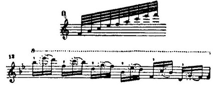 Отмечу попутно ряд пианистических фигур, показательных в особенности для раннего периода творчества Шопена, когда он не пренебрегал виртуозными эффектами. Это, например, цепь разбитых и целых терций в такте 19 вступления, это скачки терций (прыжки Лепорелло — по Шуману) в такте 23 там же и сходные скачки четвертой вариации, это мелодические секвенции разбитых секунд (такт 57 вступления), широкие форшлаги-арпеджии, остроумное (встречающееся уже у Вебера в конце первой части сонаты ор. 49) пересечение мелодии с гаммообразным аккомпанементом в вариации первой (сравни позднее коду концерта f-moll), репетиционные ноты в вариации второй, пассаж с большой септимой в вариации пятой (пример 11), пассажи в конце, окружающие побочными тонами субдоминанты (второй ступени) ноты тонического трезвучия (пример 12):