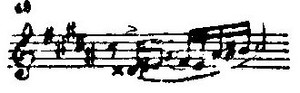 (Аналогии смотри: экспромт ор. 29 (средняя часть, такты 1-2, 17-18 и др.); фантазия-экспромт ор. 66 (Moderato cantabile, такты 1-2); этюд cis-moll ор. 25 (такты 4-5); этюд Des без опуса (такты 17-18); ноктюрн ор. 55 № 1 (такты 17, 19); вальс ор. 70 № 2 (такты 5-6). Этот оборот включает „шопеновский мотив" (определение Микетты) и повсюду носит свойственный ему эмоционально выразительный характер (объясняющийся неопределенностью, „романтичностью" вопросительного хода с первой ступени на третью после хода с доминанты на тонику). Этот оборот уже весьма выразительно употребляли Бетховен (см. первую тему финала „патетической" сонаты), Шуберт (см. трио менуэта из сонаты ор. 78). Но Шопен изолирует, особо выделяет этот оборот и тем самым усиливает его воздействие.)
