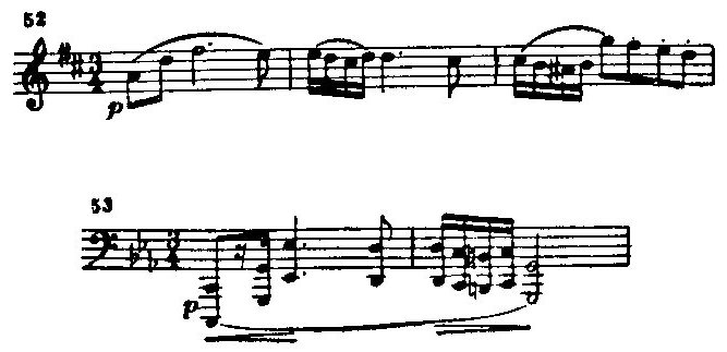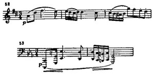 Полонез c-moll. Начало его — с тонического квартсекстаккорда (как и начало прелюдии As-dur). Яхимецкий называет этот полонез „трагической поэмой поражения, упадка и порабощения". Он приводит тему полонеза Курпиньского под названием „Привет королю польской земли", сочиненного по случаю бала в честь Александра I в Варшаве (пример 52), и не без основания считает тему полонеза Шопена (пример 53) мрачно-трагической трансформацией темы Курпиньского:
