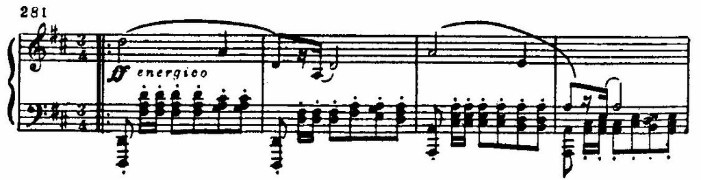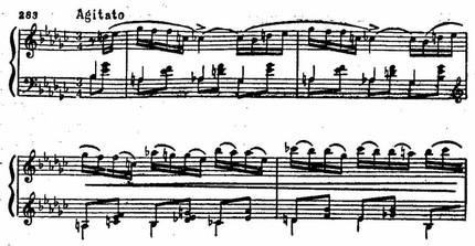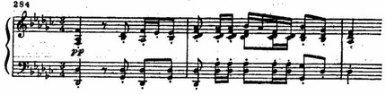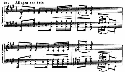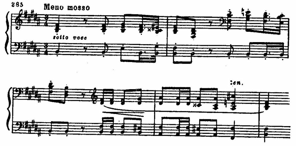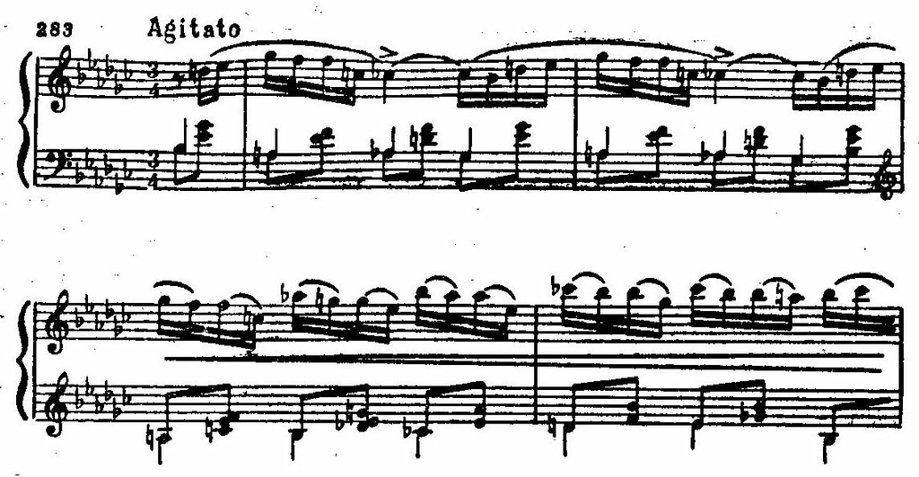 К начальному драматическому эпизоду примыкает второй — лирически страстный, как бы пронизанный мучительно напряженным током мелодического высказывания. При всей контрастности эпизодов их объединяет нервно-подвижной пульс, тональность es-moll, «говорящие» интонации и, в особенности, мелодический оборот «опевания» с обостренными полутоновыми тяготениями. По существу мелодия второго эпизода — не что иное как сложно разработанный вариант мелодического зерна первой темы: