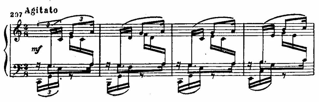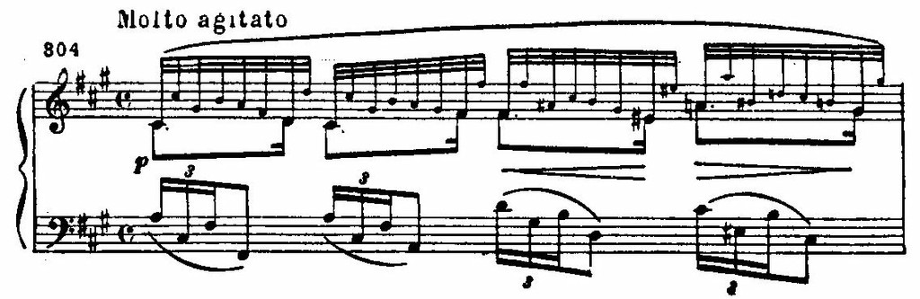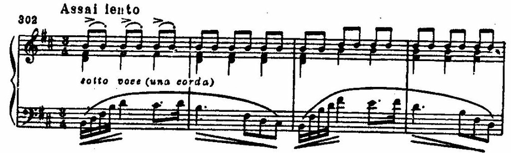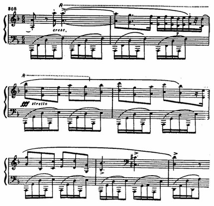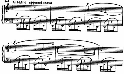 От раздела к разделу нарастает драматизм развития и в репризе достигает своего апогея. В движение приводится весь звуковой диапазон фортепиано; впервые тема проходит в октавном удвоении, поднимается в самые высокие регистры, но, словно притягиваемая грозной силой басов, тут же начинает свой неровный, уступами идущий спуск: