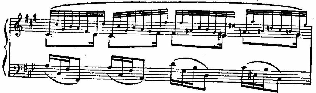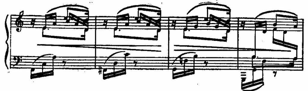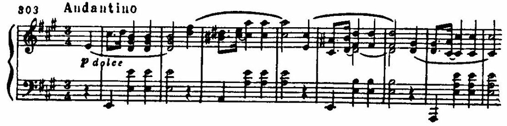 Оригинален сам мелодический образ: едва уловимы в нем отголоски лирически-страстных мелодий (более явно — во втором предложении) с близким к испано-итальянскому мелосу характерным мелодико-ритмическим оборотом, а в «струнном» тембре арпеджированных аккордов можно расслышать далекие отзвуки гитарного сопровождения: