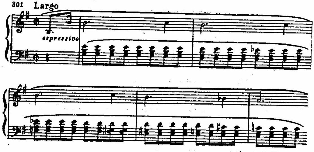 Прелюдия c-moll. Шедевр многого в малом, мощного содержания в лаконичнейшей форме. Будто скорбный образ удаляющейся погребальной процессии. Наглядный пример внутритонального обогащения (через альтерации и побочные модуляции). В конце доминантовый „каданс спада".