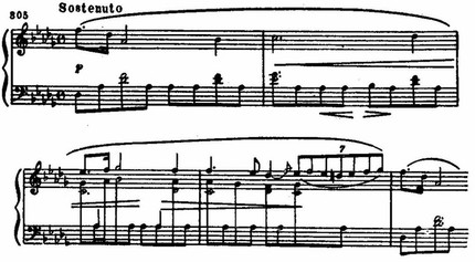 Высокая патетика модулирующих в мажор фраз (в первом и втором предложении — F-dur, C-dur, а в данном месте — в Des-dur) выявляет черты героизма этого в целом трагического образа.