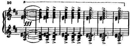 Затем после ступенчатого сбега (такты 25-18 от конца) тонического трезвучия, обыгранного тонами ais, cis, eis (как мы видели выше, это — обычное обыгрывание у Шопена), несется вверх хроматическая гамма с акцентами на полуоктавах (Тритонное членение гаммы Шопен блестяще использовал и в конце баллады g-moll (встречное движение октав).), и после автентического каданса скерцо заканчивается плагальным кадансом на тоническом басу.