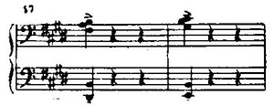 (Формальная схема скерцо [А—В—А (с разработкой А)] — [С—А—В—(А) (с разработкой А и, частично, В) — кода] очень проста и своеобразна. В ней обнаруживается слияние сонатности с принципами рондо и вариационности (аналогия — баллада f-moll). Лейхтентритт с большой натяжкой подразделяет первый раздел скерцо (такты 1-272) на главную партию (такты 1-97), побочную партию (такты 88-152) и разработку (такты 153-272). В действительности, основной, существенный контраст в указанном построении дан между первым разделом (такты 1-248), состоящим из отрывочных фрагментов, и вторым (такты 249-272) — плавно-текучим. Крупнейшая же (не резкая!) антитеза скерцо — между всей первой частью (такты 1-383) и средней частью (по Лейхтентритту — трио-интермеццо). Это остаток былых сильных шопеновских контрастов, которые ярки еще в балладе As-dur. Лейхтентритт подметил любопытную особенность скерцо — господство в нем восьмитактов, монотония которых преодолена интонационным разнообразием.)