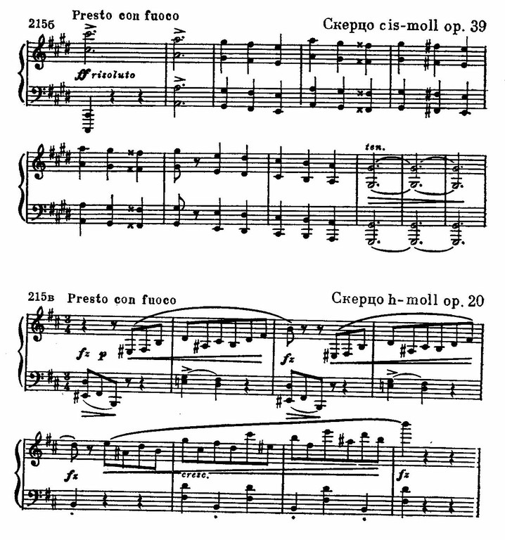 Третья часть Пятой симфонии, подчиненная внешним жанровым признакам скерцо, тем не менее окрашена в трагические тона и пронизана «стучащим», тревожным мотивом судьбы. В Девятой симфонии скерцо в высшей степени драматизировано и окрашено в зловещий колорит. Шопен развил подобные тенденции до предела. Можно проследить, как в его скерцо своеобразно романтично и пианистично преломляются и бетховенский прием резких, стаккатных звучаний (пример 215 б), и «разорванных» ритмов, и контрастное противопоставление тембров (пример 215 а), и безостановочное быстрое движение (пример 215 в):
