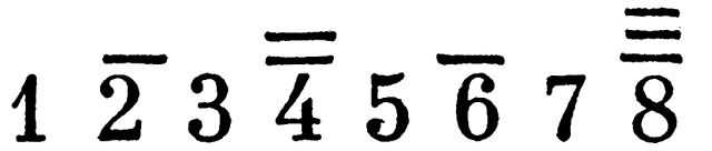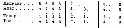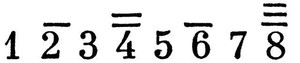 — доминантовый септаккорд с повышенной квинтой). Обозначение ступеней октавы ((до, ре (и т. д.) араб. цифрами получило нек-рое распространение в рус. школьной практике хор. пения (по цифровой системе Э. Шеве; см. Сольмизация): ступени в средней певч. октаве (1-я октава у дисканта и альта, малая — у баса и тенора) — 1, 2, 3, 4, 5, 6, 7 (пауза — 0), в более высокой октаве — с точкой сверху (