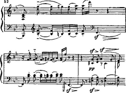 Другой образ первой части прелюдии — «в духе народной песни» (как говорит авторская ремарка) — имеет грубовато-шутливый характер благодаря октавному изложению в басу довольно размашистой мелодии и ее неожиданным остановкам на слабой доле такта: