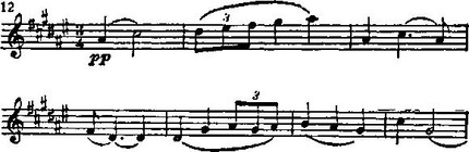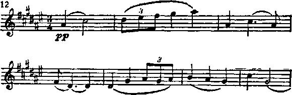 В иных оборотах (скажем, в мелодии начала Andante из первой части — пример 12) намечаются пасторальные попевки «Послеполудня фавна», «Девушки с волосами цвета льна» и т. п.: