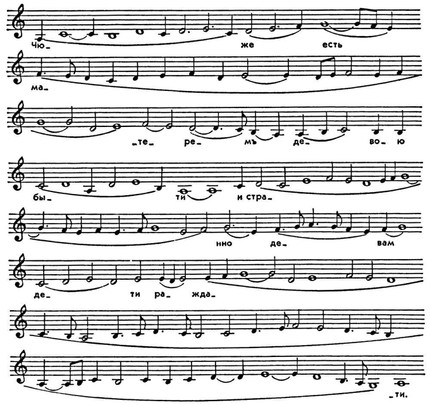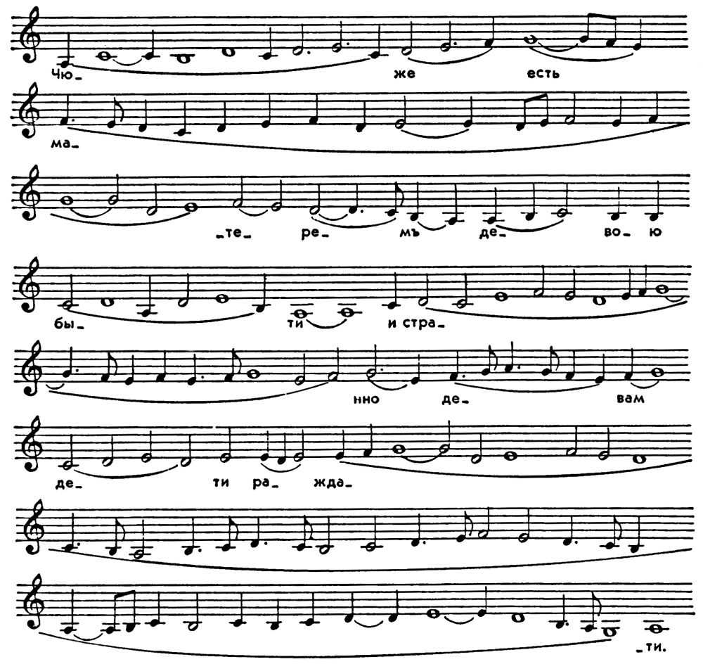 , свойственные и знаменной мелодике, в Д. р. встречаются постоянно, иногда по нескольку раз в одной мелодич. строке и даже дважды подряд. Наконец, Д. р. отличает оригинальность заключит. кадансов, представляющих поступенное движение и скачки голоса, в к-рых основной устой почти не участвует. В кадансах нек-рых произведений он появляется только в самом заключении.