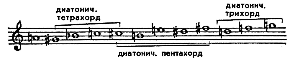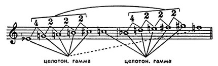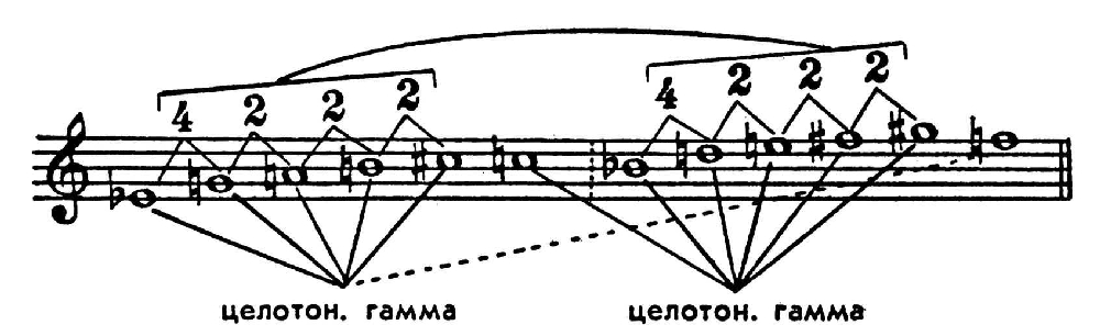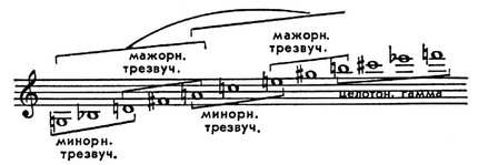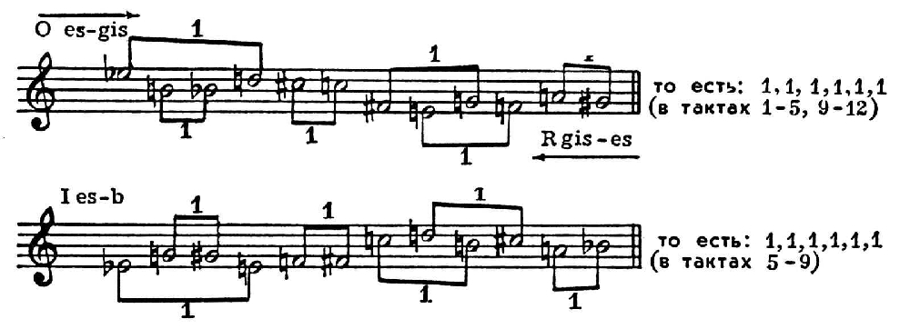 Совокупность высотных отношений между звуками серии со своей стороны потенциально определяет интонац. выразительность додекафонного сочинения. Нек-рые из наиболее очевидных высотных отношений звуков указаны в следующих примерах (цифрами обозначены интервалы в полутонах):