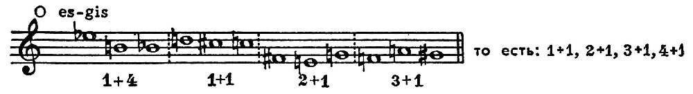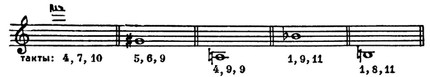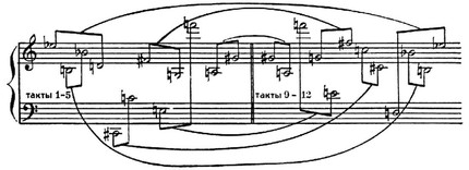 1-е и 3-е предложения одинаковы по высотному положению интервалов, но различны по ритму (гл. обр. сокращение пауз; длительности звуков повторяются ракоходно).