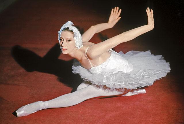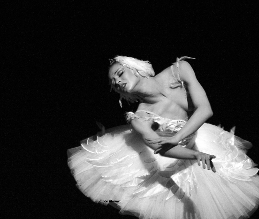 После одного такта вступления арфы с первым звуком виолончели она поднимается на пальцы и тихо и грустно плывет через сцену. Руки ее медленно подымаются над головой, потом раскрываются подобно крыльям. Но при этой попытке подняться она, как бы ослабевая, падает на колено. Метаясь из стороны в сторону, собирая остатки сил своих, она подымается на пальцы левой ноги и, жалобно закинув голову назад, трепетно бьется.