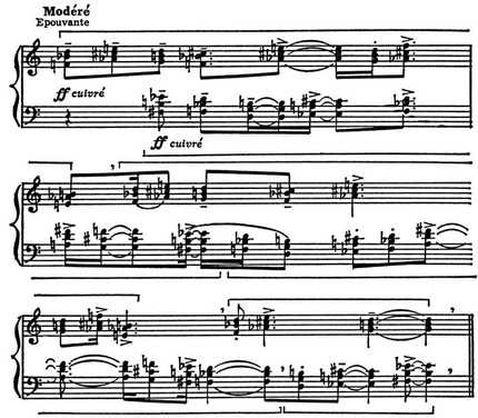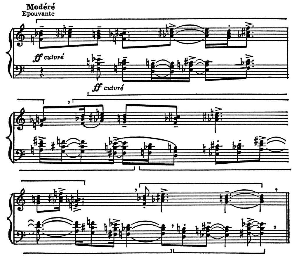 О. Meссиан. Epouvante (Ритмический канон. Пример No 50 из его книги «Техника моего музыкального языка»).