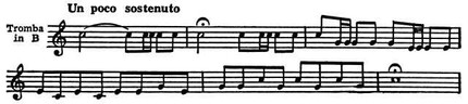 2) Трубный сигнал торжественного или воинственного характера. Обычно состоит из звуков мажорного трезвучия, к-рые можно извлечь на натуральных (без вентилей) медных дух. инструментах. В 2-гол. Ф. широко применяются т. н. валторновые ходы (см. Валторна). Темы фанфарного характера нередко используются в муз. произведениях разл. жанров — операх, симфониях, маршах и т. п. Один из наиболее ранних образцов — Ф. из 5 самостоят. партий в увертюре к опере «Орфей» Монтеверди (1607). Трубная Ф. вошла в увертюры «Леонора» No 2 (в развёрнутом виде) и «Леонора» No 3 (в более сжатом изложении), а также в увертюру «Фиделио» Бетховена.
