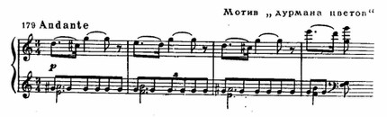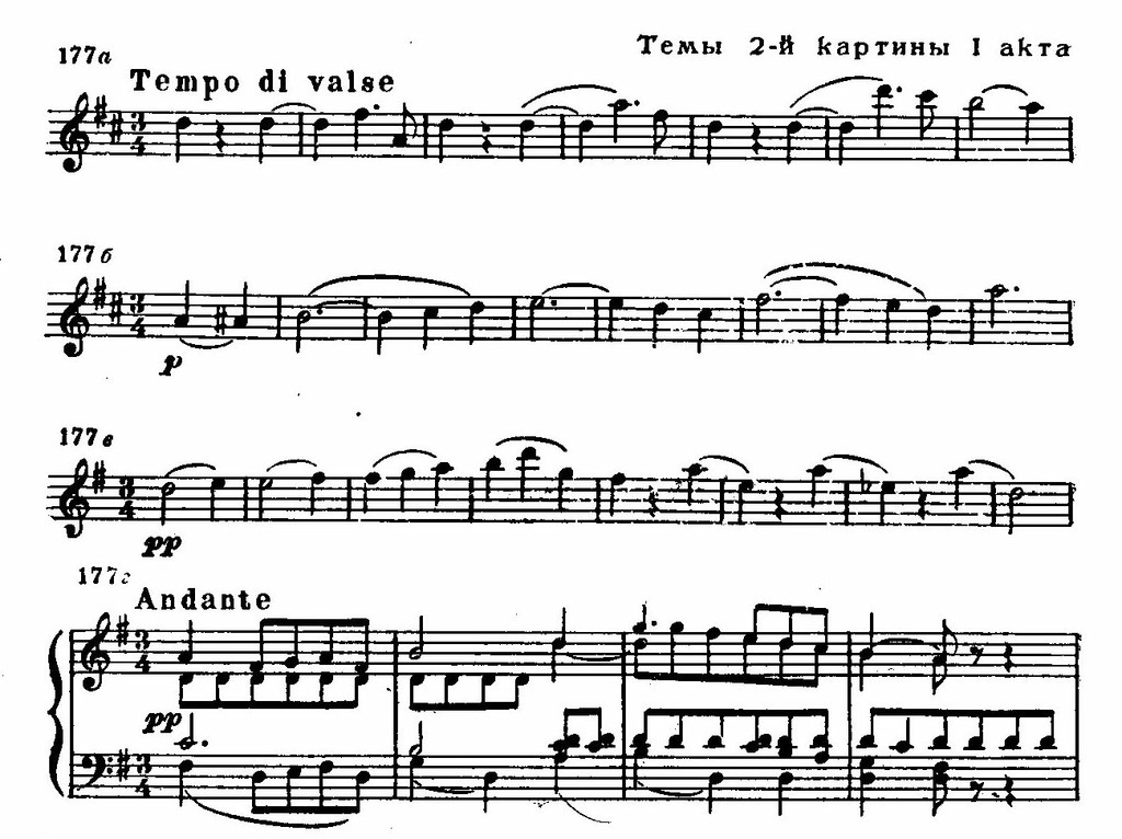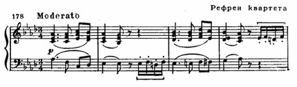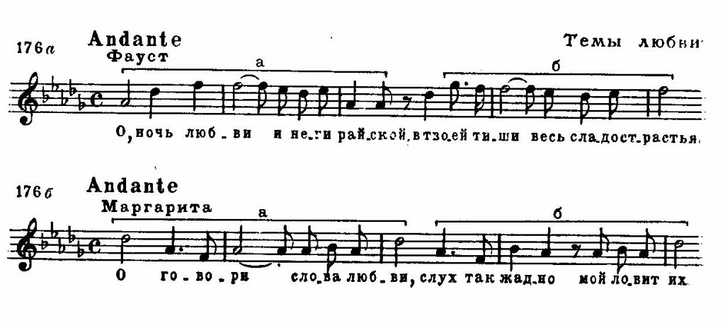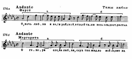 Музыкальное развитие образов проникнуто интонационным единством и целеустремленностью. Ночь, напоенная ароматом цветов, поэзия любовной страсти, чувственного очарования красиво переданы в музыке Гуно. Не только общий колорит, но и некоторые интонационные обороты, симфонически развиваемые, связывают эти номера. Можно, например, указать на краткий мотив, вычлененный из рефрена квартета (см. пример 178), или на мотив дурмана цветов, который возникает перед речитативом Мефистофеля и пронизывает музыку дуэта, представляющего собой кульминацию акта: