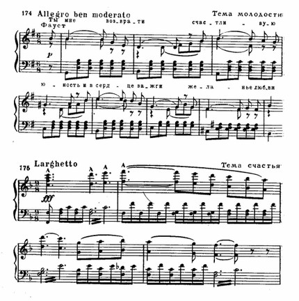 Под конец этого дуэта включены реминисценции из каватины Фауста, а в финале симфонически развита тема достигнутого счастья (см. пример 175).