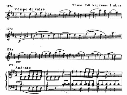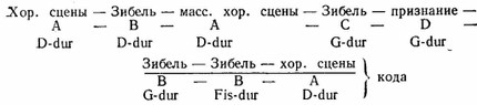 Подобные музыкально-тематические связи существуют и между различными картинами — на это уже указывалось выше. Особенно впечатляет проведение тем из 2-й картины I акта (эпизоды В и D по нашей схеме) и второй любовной темы из сцены в тюрьме, когда Маргарита вспоминает о своем счастливом прошлом.