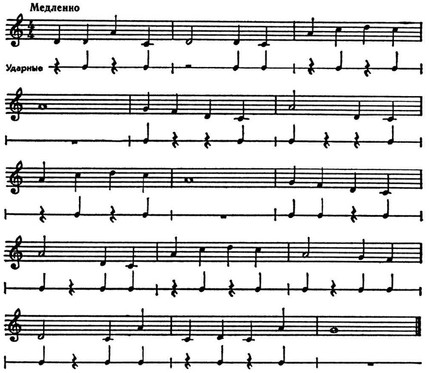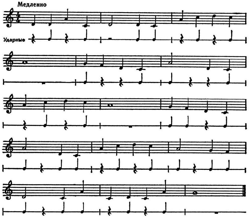 Первонач. источник Ф. м.- прежде всего в ритме («Вначале был ритм» — X. Бюлов), возникающем, по-видимому, на основе регулярного метра, непосредственно переносимого в музыку с множества жизненных явлений — пульса, дыхания, шага, ритма шествий, трудовых процессов, игр и др. (см. Иванов-Борецкий М. В., 1925; Харлап М. Г., 1972), и в эстетизации «природных» ритмов. Из первонач. связи речи и пения («Говорить и петь было вначале одно дело» — Львов H. A., 1955, с. 38) произошла самая коренная Ф. м. («Ф. м. номер один») — песня, песенная форма, объединившая в себе также и чисто поэтич., стиховую форму. Преобладающие признаки песенной формы: явная (или остаточная) связь со стихом, строфой, равномерно-ритмич. (идущая от стоп) основа строки, объединение строк в строфы, система рифм-каденций, тенденция к равенству крупных построений (в особенности — к квадратности типа 4 + 4); кроме того, часто (в более развитых песенных Ф. м.) наличие в Ф. м. двух этапов — излагающего и развивающего-заключающего. Муз. пример одного из древнейших образцов песенной Ф. м. — Застольная Сейкила (1 в. н. э. (?)), см. в ст. Древнегреческие лады, колонка 306; см. также кит. мелодию (1-е тыс. до н. э. (?)):
