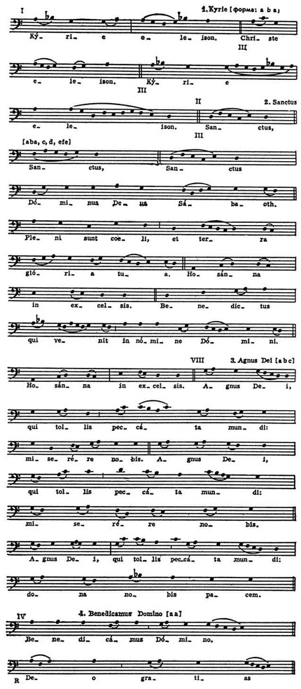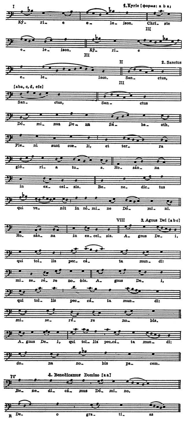 Выработанные в древней григорианской мессе Ф. м. сохранили в том или ином виде своё значение и для последующего времени, вплоть до 20 в. Формы частей ординария: Kyrie eleison трёхчастно (что имеет символич. смысл), причём каждое восклицание также делается трижды (варианты структуры — aaabbbece или ааа bbb a 1 a1 a1; aba ede efe1; aba cbc dae). Строчная Ф. м. Gloria достаточно последовательно использует один из важнейших принципов мотивно-тематич. структуры: повторение слов — повторение музыки (в 18 частях Gloria повторения слов Domine, Qui tollis, tu solus). Ф. м. Gloria (в одном из вариантов):