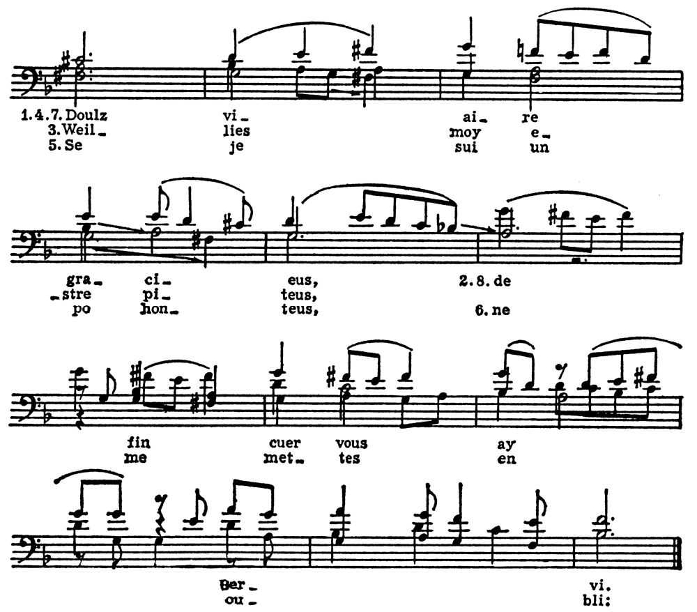 Светская музыка средневековья и Возрождения выработала ряд жанров и Ф. м., также основанных на взаимодействии слова и мелодии. Это разнообразные виды песенных и танц. Ф. м.: баллада, баллата, вильянсико, виреле, канцо (canzo), лэ, рондо, ротруэнг, эстампи и др. (см. Davison A., Apel W., 1974, NoNo 18–24). Нек-рые из них имеют совершенную поэтич. форму, составляющую настолько важный элемент Ф. м., что вне поэтич. текста она утрачивает свою структуру. Сущность такой Ф. м. — во взаимодействии повторности текстовой и музыкальной. Напр., форма рондо (здесь 8-строчная):