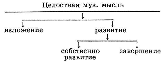 Общие логич. принципы классико-романтич. Ф. м. являются строгим и богатым воплощением норм всякого мышления в области музыки, отражающихся в определ. смысловых функциях частей Ф. м. Как и всякое мышление, музыкальное имеет предмет мысли, её материал (в метафорич. смысле — тему). Мышление выражается в муз.-логич. «обсуждении темы» («Музыкальная форма есть результат „логического обсуждения“ музыкального материала» — Стравинский И. Ф., 1971, с. 227), что в связи с временнуй и внепонятийной природой музыки как иск-ва членит Ф. м. на два логич. отдела — изложение муз. мысли и её развитие («обсуждение»). В свою очередь, логич. развитие муз. мысли состоит из её «рассмотрения» и следующего отсюда «вывода»; поэтому развитие как этап логич. развёртывания Ф. м. членится на два подотдела — собственно развитие и завершение. В результате развития классич. Ф. м. обнаруживает три осн. функции частей (соответствующие асафьевской триаде initium — motus — terminus, см. Асафьев Б. В., 1963, с. 83–84; Бобровский В. П., 1978, с. 21–25) — экспозиционную (изложение мысли), развивающую (собственно развитие) и завершающую (утверждение мысли), сложно соотнесённые друг с другом: