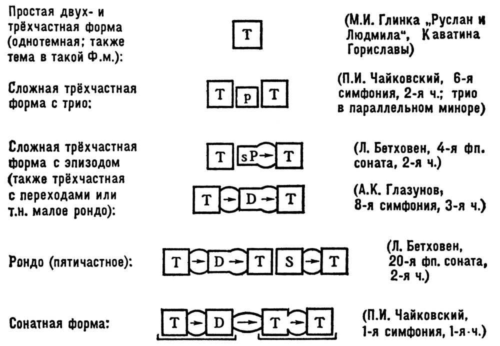 Схемы некоторых основных классико-романтических Ф. м. (с т. зр. высших факторов их структуры; Т, D, p — функциональные обозначения тональностей, — модуляция; прямые линии — устойчивое построение, изогнутые — неустойчивое) см. в колонке 894.