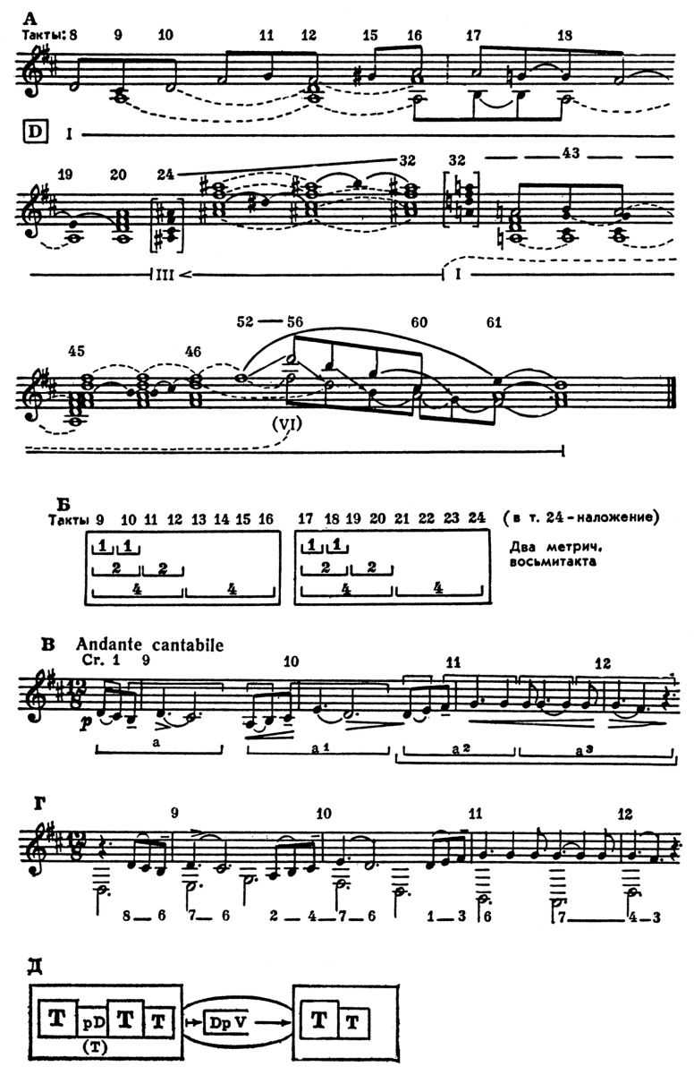 Схема, А: вся гл. тема 1-й ч. Andante базируется на тонике D-dur, первое проведение побочной темы-дополнения — на тонике Fis-dur, далее обе регулируются тоникой D-dur. Схема Б (гл. тема, ср. со схемой В): на однотакт отвечает другой однотакт, на получившийся двутакт отвечает более слитное двутактовое построение, на образовавшееся замкнутое кадансом четырёхтактовое предложение отвечает др. такое же с более устойчивой каденцией. Схема В: на основе метрич. структуры (схема Б) мотивное развитие (показан фрагмент) исходит из однотактового мотива и осуществляется путём повторения его в др. гармониях, с изменением мелодич. линии (а1) и метроритма (а2, а3).