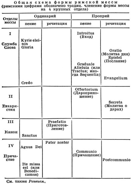 Общая схема формы римской мессы (римскими цифрами обозначено традиц. членение формы мессы на 4 крупных отдела).