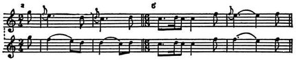 («плика нисходящая»). Эти знаки обозначали восходящее и нисходящее последования долгого и более короткого звуков (обычно в секундовом отношении). Позднее посредством разл. форм знака плики стали обозначать и длительность её звуков. Ф. в совр. смысле появился в 1-й пол. 17 в. Он не всегда обозначался в нотах; нередко, как и др. украшения, исполнитель вводил его по собств. усмотрению. Ф. означал гл. обр. выполняющий мелодич. функцию безударный звук перед сильной долей. Ф. снизу встречался чаще, чем Ф. сверху; оба эти рода существенно различались. Ф. снизу (франц. port de voix и accont plaintif в лютневой музыке, англ. beat, half-beat и fore-fall) обозначался занятой, перевёрнутой запятой, косой чёрточкой и др. знаками. Первоначально он исполнялся за счёт предыдущего звука.